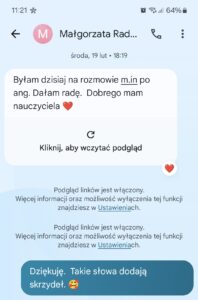Podczas zajęć online pracujesz z doświadczonym lektorem o odpowiednim wykształceniu językowym, który potrafi słuchać i reagować na Twoje potrzeby na bieżąco. Zyskasz w nim wsparcie, które będzie Ci towarzyszyć przez lata. Ta opinia przesłana sms'em mówi sama za siebie 🙂